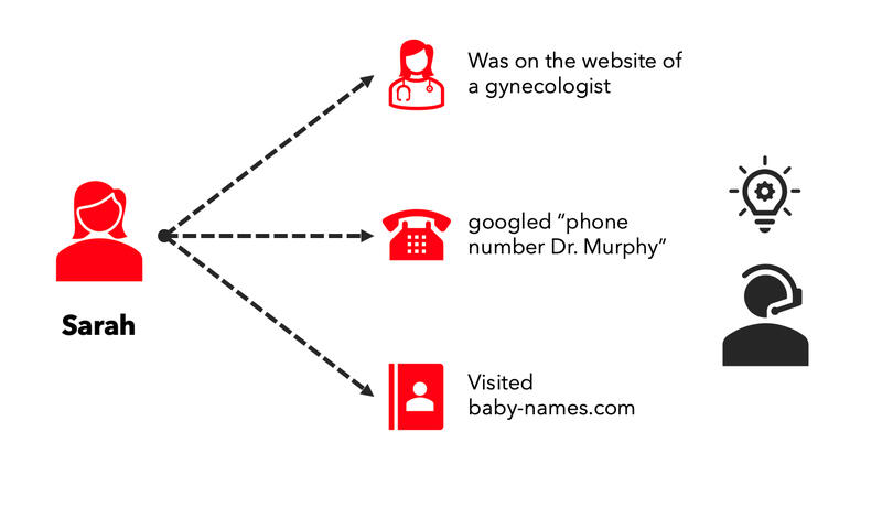 Sarah is surfing on the Internet and is being tracked. We know she was on a gynecologist’s website and googled the phone number of a "Dr. Murphy". 15 Minutes later, she visited a domain called baby-names.comKnowing nothing but her surfing history: take a wild guess - what happened?Sarah got pregnant. If we can make this conclusion from such little information, imagine what private details data companies know about you, having almost infinite time and data sets to learn from.Then, the data might be saved, analyzed and used for a wide variety of purposes. In the best case it will only be used for targeted marketing. But it can also be used for behavior analysis, manipulation or even political influence. On top of this, your data could get publicly exposed in a data breach or sold to third parties. Money is made with your personal information.